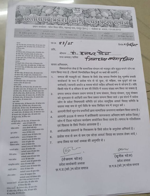 क़ो. मरार पटेल समाज के विकास हेतु तय जोन बैठक का आयोजन 21 जून 2025 दिन शनिवार क़ो होना है.. जिसमें अलग अलग विभिन्न सामाजिक मुद्दों और विकास बिन्दुओ पर चर्चा किया जाना है डॉ हलधर पटेल जिलाध्यक्ष मरार पटेल समाज सारंगढ़ द्वारा बताया गया कि आदरणीय प्रदेश संयोजक भैया राजेंद्र नायक पटेल एवं प्रदेश अध्यक्ष सुनील जी अपने टीम के साथ सारंगढ़ की बैठक में शामिल होंगे जिसमें विभिन्न सामाजिक बिन्दुओ क़ो रखते हुए इसे गाँव गांव तक जोड़ने और विकास करने की कार्य किया जायेगा